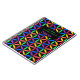 Abstract geometric design of interlacing circles, bright rainbow colours on black background