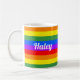 This personalised rainbow coffee mug features bright, vibrant rainbow stripes in bold red, orange, yellow, green, blue and purple. Personalise this mug with your name or a text of your choosing. This would be great for those who love rainbows and bright colours. This would make a great gift for a friend, part of a get well package, or a personal touch on a college care package.