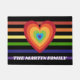Bright rainbow stripes and retro style heart personalised doormat- Cute housewarming gift for newlyweds and hippies. Personalised, welcome doormat with custom family name at the bottom in retro style, white lettering. Retro style, rainbow colours heart. Background is bright, colourful rainbow stripes pattern on black. Change black background colour if you wish or lettering style and/or colour. We have more rainbow stripes decor in our Zazzle.com/angela65* shop.