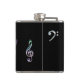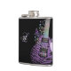 Personalised Rainbow Notes Electric Guitar Flask. A purple tiger striped electric guitar with a pastel rainbow lighting on the neck and a swirl of colourful musical notes. The perfect pocket stash for your favourite musical elixir. Never see a concert without it. Fill in your name and initial at the prompt to personalise and customise as desired. A great gift for your favourite guitar player, musician or music lover.