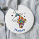 A magical custom button badge showing a unicorn with a flowing rainbow mane with colourful stars scattered around. Perfect for all unicorn lovers.