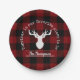 The product design features a silhouetted profile of a reindeer on a classic red and black buffalo plaid pattern. Combined with your own personalised text, this composition makes farmhouse country-style, modern, and unique paper plates for Thanksgiving, Christmas holiday, family reunion, or any other special gatherings!