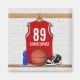 Personalised Red and white basketball jersey hanging in a locker room with a basketball , basketball sneakers and a drinks bottle. The jersey is customisable with your own numbers and name, to create a truly unique gift for the Basketball player or basketball fan. If you require a different colour combination contact us via the store prior to purchase. sgb01