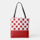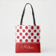 This personalised bag features a red polka-dot pattern over a white background. A matching section at the bottom has a template area for you to personalise it with a name or other custom text. Click "Customise It" to change the size of the dots.