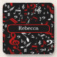 Perfect gift for the music lover or musician with a design featuring a random jumbled pattern of musical notes and treble clefs in red and white on a classical black background. Easy to customise with your own text on a coordinating accent.