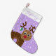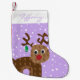 Personalised Reindeer Small Christmas Stocking. Cute Christmas reindeer with red nose and a green ornament hanging from his antlers. Light purple background. Personalise with their name in pretty scripted font.