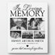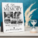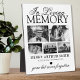 Memorial plaque featuring a crisp white background, 5 photos of your lost loved one, the text "in loving memory", their name, birth/death dates, a black heart, and the remembrance saying "gone but never forgotten".