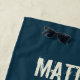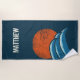 Create a personalised beach towel with a classic surf style. It features a retro style illustration of crashing waves in shades of blue with a glowing orange sun above and seagulls silhouetted against the sun. The illustrations is set against a navy blue background. The graphic has a distressed style giving it a worn, vintage look. Distressed style lettering in ivory white spells out your name or other message.