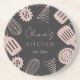 Introducing our Personalised Rose Gold Glitter Cooking Tools Paper Coaster. Featuring faux blush pink glitter, kitchen utensils. and customable texts on black background. Suitable for chef, home cook, and cooking enthusiasts.