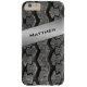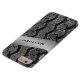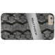 This manly black and silver rubber tire tread pattern iPhone 6 Plus case has a FAUX metallic silver look band with template text for you to add your monogram, initials, name or other text to. If you need assistance, email niteowlstudio@gmail.com.