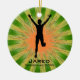 Runner Racer Personalised Ornament Christmas 20XX. An runner poses at the finish line against a green and orange starburst background. All text customisable, front and back!