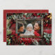 This personalised Christmas card features a festive design with a central family photo framed in a rustic wooden border. Surrounding the photo is a vibrant holiday wreath with pinecones, red berries, and evergreen branches. The backdrop has a deep red, wood-textured look that complements the holiday theme. Above the picture, elegant white script reads "Merry Christmas!" while the bottom of the card displays the text of your family's name in a matching font. The overall design evokes a cosy and warm holiday atmosphere.