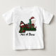 An adorable baby's first Christmas T-shirt, bodysuit, or long sleeve tee featuring a baby dressed in a Santa suit and hat with gifts and holly and a place you can easily add your baby's name before ordering.