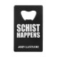 This geology-themed bottle opener features the classic, corny phrase "Schist Happens," a pun variation on another common saying. The design is in bold, white block letters on a black background. Below that is a space for your name or short message!