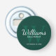 This bottle opener features personalised groomsman's name in white classic script font style with wedding details in white classic serif font style and monogram in light emerald green classic serif font style as background, on emerald green background.