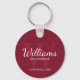 This keychain features personalised groomsman's name in white classic script font style with wedding details in white classic serif font style and monogram in light burgundy red classic serif font style as background, on burgundy red background.