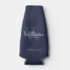 This bottle cooler features personalised groomsman's name in white classic script font style with wedding details in white classic serif font style and monogram in light navy blue classic serif font style as background, on navy blue background.