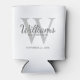 This can cooler features personalised groomsman's name in grey classic script font style with wedding details in grey classic serif font style and monogram in light grey classic serif font style as background, on white background.