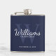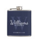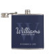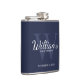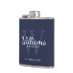This flask features personalised groomsman's name in white classic script font style with wedding details in white classic serif font style and monogram in light navy blue classic serif font style as background, on navy blue background.