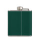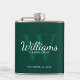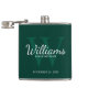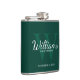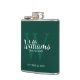 This flask features personalised groomsman's name in white classic script font style with wedding details in white classic serif font style and monogram in light emerald green classic serif font style as background, on emerald green background.