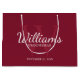 This gift bag features personalised groomsman's name in white classic script font style with wedding details in white classic serif font style and monogram in light burgundy red classic serif font style as background, on burgundy red background.