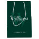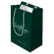 This gift bag features personalised groomsman's name in white classic script font style with wedding details in white classic serif font style and monogram in light emerald green classic serif font style as background, on emerald green background.