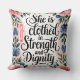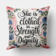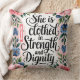 A watercolor illustration with a floral border. Inside the border, there's bold calligraphy text that says "She is clothed in strength and dignity Proverbs 31:25 ". The text is in an elegant style. The background is a soft pink.. personalised with name.