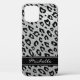 Personalised faux silver glitter leopard print iPhone 12 case. Luxurious silvery background texture with elegant script typography text for custom name or monogram. Chic animal spots design with fake glimmering shiny sparkles. Luxury style gift idea for stylish women and teen girls. Glittery look and exotic sparkly pattern. Cute Birthday or Christmas gift idea for sister, mum, mother, aunt, daughter, etc.