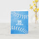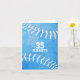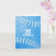 This simply designed softball themed greeting card features the stylised image of an abstractly enlarged blue softball with white stitching on the front and inside left of the card - customise the player's name and jersey number on the front and your custom message above small softball on the right inside of the card - by katz_d_zynes