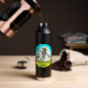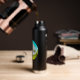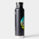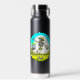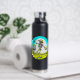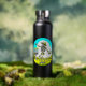 Blue and green personalised water bottle with a vintage retro vibe featuring a skeleton in a sunhat disc golfing in the woods.