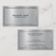 Personalised, slick metallic silver-grey texture print background, stainless steel with shiny silver-toned border accents, business card template. Customisable black typography.