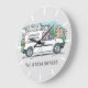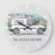 Small Business promotion with Name on a Company Van. Color illustration of a driver at the wheel of a white van. Illustration of a Courier service or delivery man with a white van. Small Business Wall Clock. Parcel delivery Business.