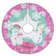 Three snowmen of various sizes with pink and blue winter hats, one wearing ice skates, a pink and aqua blue background with white polka dots and snowflakes of white with a pink banner you can easily personalise with your family name on a holiday tree skirt you're sure to love for years to come!