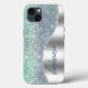 This chic design features a digital image made up of sparkly iridescent diamond chips arranged in a pattern imitating snakeskin in shimmering shades of mint green, aqua, turquoise, teal, purple and lavender. A silver foil image on the right in the shape of a wave bordered with silver faux glitter provides the background for your name or monogram in a stylish teal handwritten brush font.