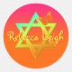 This round personalised Bat Mitzvah sticker has a neon green, orange, pink, yellow and blue Star of David and a bright orange and yellow butterfly on it that matches the Bat Mitzvah invitation shown below. The text is customisable. If you require any other matching items, please email niteowlstudio@gmail.com with your request.