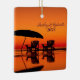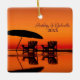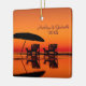 A beach scene with the sun setting while the ocean waves crashing up with 2 empty chairs in the water. Personalise by adding your names and a year.