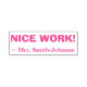 This stamp design features the message "NICE WORK!", and a personalised teacher name. It could be used by a teacher while grading assignments to acknowledge a student that has done a particularly good job.