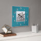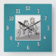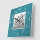 A simple wall clock where the time circles around you or your beloved ones! Add your personal photo and this clock will transfer into a valuable item for yourself or someone you'd like to surprise! The coloured square frame is teal, and digits are white with black shadow. There exists 5 colour variations of this design - teal, black, silver, blue and pink.