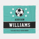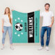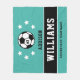 Personalised soccer themed fleece blanket for soccer players when they're not scoring goals on the field, and for their parents to support their kids and stay warm at chilly games! Makes a unique team gift for travel tournaments. Design features a soccer ball customised with the player's uniform number, custom text for the player's first and last name, and modern text for the soccer club team name. Stylish and modern design features sporty varsity jersey lettering and simple horizontal stripes with star accents. The colour scheme of aqua / teal blue, black, and white can be modified to coordinate with your team colours.