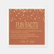 Elegant wedding FUN FACTS in TERRACOTTA Rust colour. Not cheap looking but expensive and classy. Personalised with Last name (or delete). Faux gold foil confetti background. Font and size can be edited. Background colour can be changed. Cocktail napkins also available. Contact Designer for special designs.