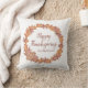 Personalised family name Thanksgiving throw pillow in a watercolor fall leaves design with dried orange slices and cinnamon stick accents.