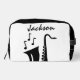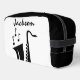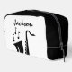 Personalised toiletry bag with saxophone design. Cool pesonalized name bathroom accessory. Fun item for player, music teacher, music school teacher, musician, artist, performer, student, shop owner etc. Elegant script typography template. Modern instrument design with name. Black and white or custom colours. Great present for Father's Day or Birthday.