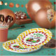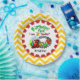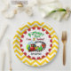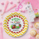 Train theme 3rd birthday paper plates features a locomotive, cars, and caboose on an oval train track with steam with text that reads Choo Choo! A bright yellow and white chevron stripe border edge with red circular trim, green, red, and yellow text that reads Birthday Fun I am 3 Today, and an area you can add the birthday child's name before ordering makes these train theme paper plates a great fit for that train theme third birthday party!