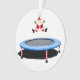 Creative trampoline keepsake ornament holiday gift featuring trampoline-jumping Santa Claus and special place for personalised name on back.