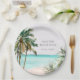 Add a tropical touch to your beach house decor with this personalised Paper Plates! Featuring a watercolor blue beach, palm tree, green palm leaves, and summer vibes.