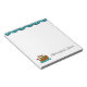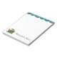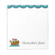 Cute note pad suitable for any desk in any office or school. In the bottom left corner is a small cartoon tugboat. It has a wooden brown bottom and a cream coloured cabin with a red roof, a brown wooden door and a blue round window. On the back of the boat is a red flag waving in the breeze. The tug is sailing on the open blue sea. Next to the boat in fancy black lettering is a template to add your name or other text to personalise this notepad. Across the top of the pad are some blue waves to finish off this nautical theme.