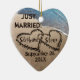 FYI: The heart shape ornament with this design is now available in acrylic. Easily add your own custom names or any text (shown example says: "Just Married" with names of the bride and groom in the hearts and the date) to personalise this beautiful popular heart shape ornament with an original photo of two hearts written in the sand along the blue ocean water to signify love and romance. Great concept for love, travel, first Christmas holiday together, and upcoming summer save the date weddings. A fun, cute, personal and unique keepsake ornament to give to that special someone, girlfriend or boyfriend, bride and groom or any sweethearts couple. This design is on both sides and is available with the design on one side as well.