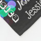 Personalised name subway art Christmas blanket- Holiday theme background photo of bright, multicolored Christmas bokeh lights in blue, orange, red, purple, and teal green on black background. Allover typography print of personalised name in several different white lettering styles. Cute Christmas baby shower gift or Christmas gift for a teen girl.