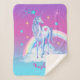 This personalised Sherpa blanket shows a mythical, majestic pink, purple, and blue unicorn standing on puffy white clouds in a unicorn cotton candy sky with a rainbow beaming in from the side. There are shooting stars in teal blue and pink, along with yellow and aqua blue stars in the background. Add your name or other text along the bottom.