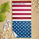 Add any name to this fun and patriotically festive USA flag design beach towel.